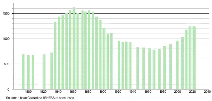 | L'évolution du nombre d'habitants est connue à travers les recensements de la population effectués dans la commune depuis 1793. Pour les communes de moins de 10 000 habitants, une enquête de recensement portant sur toute la population est réalisée tous les cinq ans, les populations de référence des années intermédiaires étant quant à elles estimées par interpolation ou extrapolation[36]. Pour la commune, le premier recensement exhaustif entrant dans le cadre du nouveau dispositif a été réalisé en 2006[37]. En 2022, la commune comptait 1 235 habitants[Note 6], en évolution de −0,8 % par rapport à 2016 (Tarn : +2,52 %, France hors Mayotte : +2,11 %). |