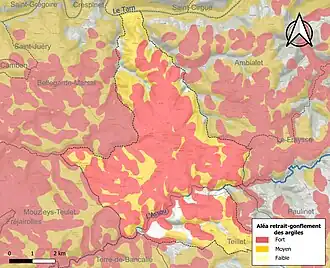 La commune est vulnérable au risque de mouvements de terrains constitué principalement du retrait-gonflement des sols argileux[23]. Cet aléa est susceptible d'engendrer des dommages importants aux bâtiments en cas d’alternance de périodes de sécheresse et de pluie. 92,3 % de la superficie communale est en aléa moyen ou fort (76,3 % au niveau départemental et 48,5 % au niveau national). Sur les 576 bâtiments dénombrés sur la commune en 2019, 570 sont en aléa moyen ou fort, soit 99 %, à comparer aux 90 % au niveau départemental et 54 % au niveau national. Une cartographie de l'exposition du territoire national au retrait gonflement des sols argileux est disponible sur le site du BRGM[24],[Carte 3].