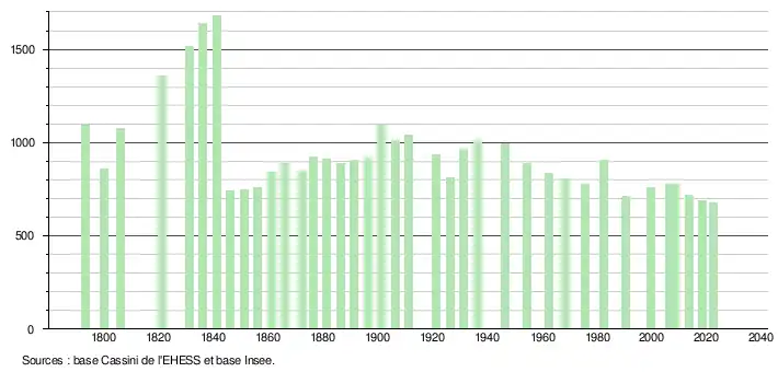 L'évolution du nombre d'habitants est connue à travers les recensements de la population effectués dans la commune depuis 1793. Pour les communes de moins de 10 000 habitants, une enquête de recensement portant sur toute la population est réalisée tous les cinq ans, les populations de référence des années intermédiaires étant quant à elles estimées par interpolation ou extrapolation[11]. Pour la commune, le premier recensement exhaustif entrant dans le cadre du nouveau dispositif a été réalisé en 2008[12].