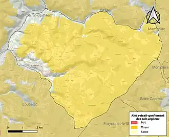 Les mouvements de terrains susceptibles de se produire sur la commune sont des tassements différentiels[35]. Le retrait-gonflement des sols argileux est susceptible d'engendrer des dommages importants aux bâtiments en cas d’alternance de périodes de sécheresse et de pluie[36]. 88,4 % de la superficie communale est en aléa moyen ou fort (58,6 % au niveau départemental et 48,5 % au niveau national métropolitain)[Carte 3]. Depuis le , en application de la loi ÉLAN, différentes contraintes s'imposent aux vendeurs, maîtres d'ouvrages ou constructeurs de biens situés dans une zone classée en aléa moyen ou fort[Note 3],[37].