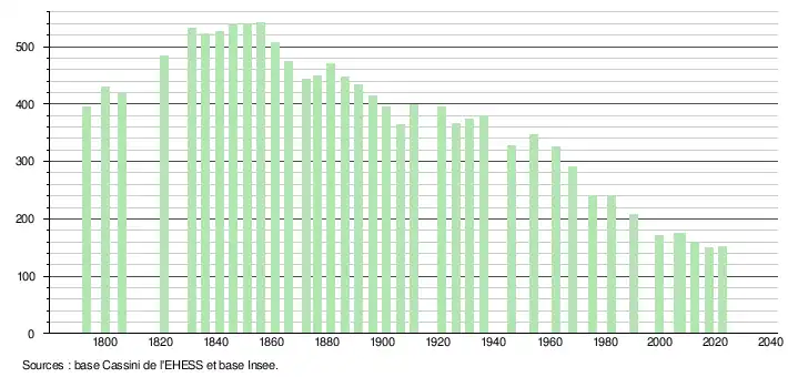 L'évolution du nombre d'habitants est connue à travers les recensements de la population effectués dans la commune depuis 1793. Pour les communes de moins de 10 000 habitants, une enquête de recensement portant sur toute la population est réalisée tous les cinq ans, les populations de référence des années intermédiaires étant quant à elles estimées par interpolation ou extrapolation[21]. Pour la commune, le premier recensement exhaustif entrant dans le cadre du nouveau dispositif a été réalisé en 2007[22].