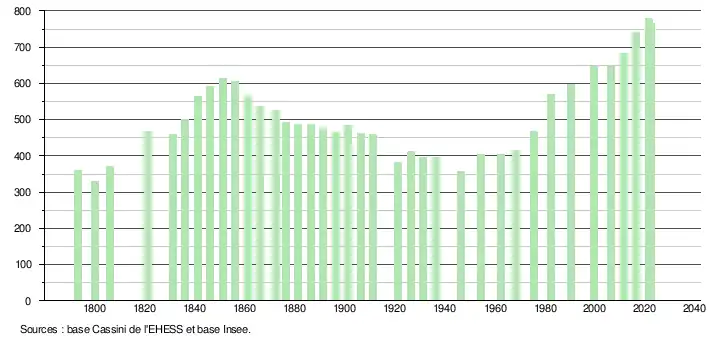 - ↑ Population municipale de référence en vigueur au 1er janvier 2025, millésimée 2022, définie dans les limites territoriales en vigueur au 1er janvier 2024, date de référence statistique : 1er janvier 2022.
