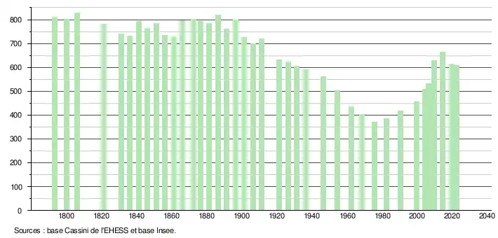 L'évolution du nombre d'habitants est connue à travers les recensements de la population effectués dans la commune depuis 1793. Pour les communes de moins de 10 000 habitants, une enquête de recensement portant sur toute la population est réalisée tous les cinq ans, les populations de référence des années intermédiaires étant quant à elles estimées par interpolation ou extrapolation[15]. Pour la commune, le premier recensement exhaustif entrant dans le cadre du nouveau dispositif a été réalisé en 2004[16].