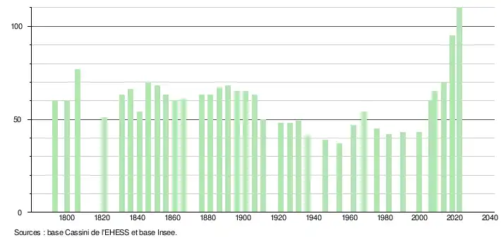 - ↑ Population municipale de référence en vigueur au 1er janvier 2025, millésimée 2022, définie dans les limites territoriales en vigueur au 1er janvier 2024, date de référence statistique : 1er janvier 2022.