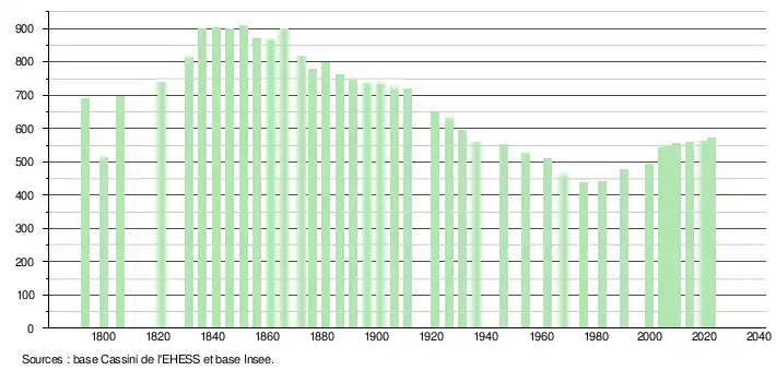 L'évolution du nombre d'habitants est connue à travers les recensements de la population effectués dans la commune depuis 1793. Pour les communes de moins de 10 000 habitants, une enquête de recensement portant sur toute la population est réalisée tous les cinq ans, les populations de référence des années intermédiaires étant quant à elles estimées par interpolation ou extrapolation[26]. Pour la commune, le premier recensement exhaustif entrant dans le cadre du nouveau dispositif a été réalisé en 2004[27].