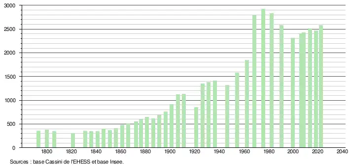 L'évolution du nombre d'habitants est connue à travers les recensements de la population effectués dans la commune depuis 1793. Pour les communes de moins de 10 000 habitants, une enquête de recensement portant sur toute la population est réalisée tous les cinq ans, les populations de référence des années intermédiaires étant quant à elles estimées par interpolation ou extrapolation[32]. Pour la commune, le premier recensement exhaustif entrant dans le cadre du nouveau dispositif a été réalisé en 2008[33].
