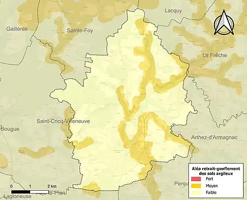 Le retrait-gonflement des sols argileux est susceptible d'engendrer des dommages importants aux bâtiments en cas d’alternance de périodes de sécheresse et de pluie. 23,4 % de la superficie communale est en aléa moyen ou fort (19,2 % au niveau départemental et 48,5 % au niveau national). Sur les 1 125 bâtiments dénombrés sur la commune en 2019, 197 sont en aléa moyen ou fort, soit 18 %, à comparer aux 17 % au niveau départemental et 54 % au niveau national. Une cartographie de l'exposition du territoire national au retrait gonflement des sols argileux est disponible sur le site du BRGM[21],[Carte 2].