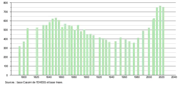 - ↑ Population municipale de référence en vigueur au 1er janvier 2025, millésimée 2022, définie dans les limites territoriales en vigueur au 1er janvier 2024, date de référence statistique : 1er janvier 2022.