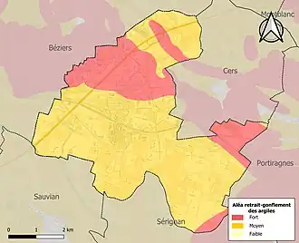 La commune fait partie du territoire à risques importants d'inondation (TRI) de Béziers-Agde, regroupant 15 communes autour des bassins de vie de Béziers et d'Agde, un des 31 TRI qui ont été arrêtés fin 2012 sur le bassin Rhône-Méditerranée[17], retenu au regard des submersions marines et des débordements de cours d’eau, notamment d'ouest en est, de l'Orb, du Libron et de l'Hérault. Les crues historiques antérieures à 2019 les plus significatives sont celles du , un épisode généralisé sur la quasi-totalité du bassin, et du , un épisode cévenol en partie supérieure du bassin. Des cartes des surfaces inondables ont été établies pour trois scénarios : fréquent (crue de temps de retour de 10 ans à 30 ans), moyen (temps de retour de 100 ans à 300 ans) et extrême (temps de retour de l'ordre de 1 000 ans, qui met en défaut tout système de protection)[18]. La commune a été reconnue en état de catastrophe naturelle au titre des dommages causés par les inondations et coulées de boue survenues en 1982, 1984, 1986, 1987, 1993, 1995, 1996, 1997, 2005, 2014 et 2019[19],[15].