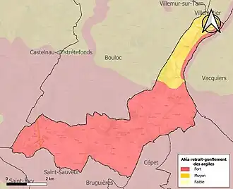 Le retrait-gonflement des sols argileux est susceptible d'engendrer des dommages importants aux bâtiments en cas d’alternance de périodes de sécheresse et de pluie. La totalité de la commune est en aléa moyen ou fort (88,8 % au niveau départemental et 48,5 % au niveau national). Sur les 594 bâtiments dénombrés sur la commune en 2019, 594 sont en aléa moyen ou fort, soit 100 %, à comparer aux 98 % au niveau départemental et 54 % au niveau national. Une cartographie de l'exposition du territoire national au retrait gonflement des sols argileux est disponible sur le site du BRGM[24],[Carte 3].