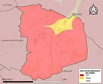 Le retrait-gonflement des sols argileux est susceptible d'engendrer des dommages importants aux bâtiments en cas d’alternance de périodes de sécheresse et de pluie. La totalité de la commune est en aléa moyen ou fort (75,2 % au niveau départemental et 48,5 % au niveau national). Sur les 135 bâtiments dénombrés sur la commune en 2019, 135 sont en aléa moyen ou fort, soit 100 %, à comparer aux 94 % au niveau départemental et 54 % au niveau national. Une cartographie de l'exposition du territoire national au retrait gonflement des sols argileux est disponible sur le site du BRGM[20],[Carte 3].