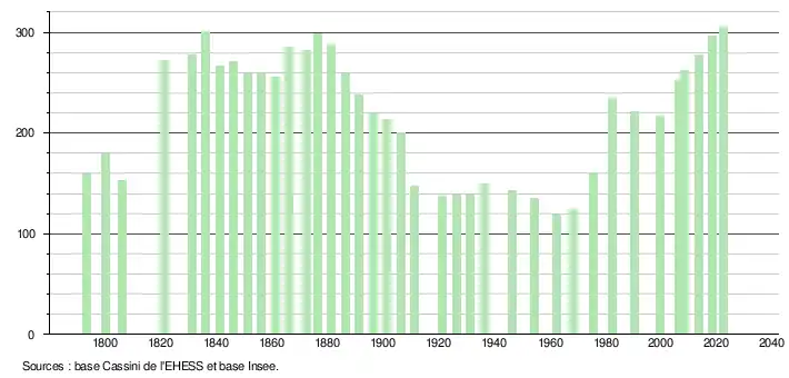 L'évolution du nombre d'habitants est connue à travers les recensements de la population effectués dans la commune depuis 1793. Pour les communes de moins de 10 000 habitants, une enquête de recensement portant sur toute la population est réalisée tous les cinq ans, les populations de référence des années intermédiaires étant quant à elles estimées par interpolation ou extrapolation[16]. Pour la commune, le premier recensement exhaustif entrant dans le cadre du nouveau dispositif a été réalisé en 2008[17].