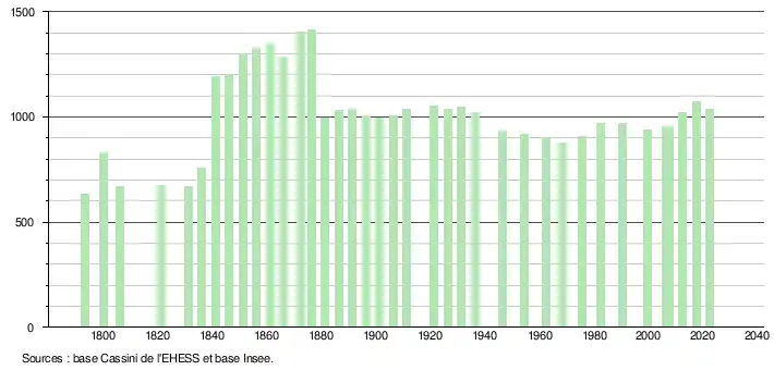 L'évolution du nombre d'habitants est connue à travers les recensements de la population effectués dans la commune depuis 1793. Pour les communes de moins de 10 000 habitants, une enquête de recensement portant sur toute la population est réalisée tous les cinq ans, les populations de référence des années intermédiaires étant quant à elles estimées par interpolation ou extrapolation[30]. Pour la commune, le premier recensement exhaustif entrant dans le cadre du nouveau dispositif a été réalisé en 2007[31].