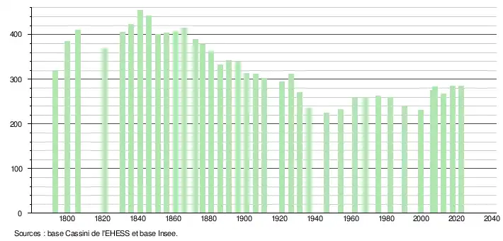 L'évolution du nombre d'habitants est connue à travers les recensements de la population effectués dans la commune depuis 1793. Pour les communes de moins de 10 000 habitants, une enquête de recensement portant sur toute la population est réalisée tous les cinq ans, les populations de référence des années intermédiaires étant quant à elles estimées par interpolation ou extrapolation[23]. Pour la commune, le premier recensement exhaustif entrant dans le cadre du nouveau dispositif a été réalisé en 2007[24].
