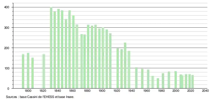 - ↑ Fiches Insee - Populations de référence de la commune pour les années 2006, 2007, 2008, 2009, 2010, 2011, 2012, 2013, 2014, 2015, 2016, 2017, 2018, 2019, 2020, 2021 et 2022.