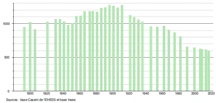 L'évolution du nombre d'habitants est connue à travers les recensements de la population effectués dans la commune depuis 1793. Pour les communes de moins de 10 000 habitants, une enquête de recensement portant sur toute la population est réalisée tous les cinq ans, les populations de référence des années intermédiaires étant quant à elles estimées par interpolation ou extrapolation[17]. Pour la commune, le premier recensement exhaustif entrant dans le cadre du nouveau dispositif a été réalisé en 2008[18].