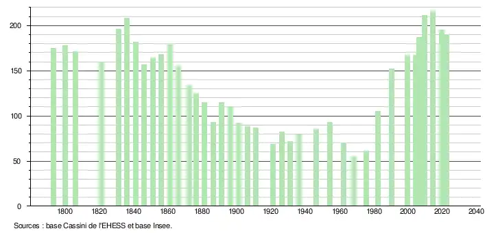 L'évolution du nombre d'habitants est connue à travers les recensements de la population effectués dans la commune depuis 1793. Pour les communes de moins de 10 000 habitants, une enquête de recensement portant sur toute la population est réalisée tous les cinq ans, les populations de référence des années intermédiaires étant quant à elles estimées par interpolation ou extrapolation[21]. Pour la commune, le premier recensement exhaustif entrant dans le cadre du nouveau dispositif a été réalisé en 2004[22].
