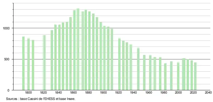L'évolution du nombre d'habitants est connue à travers les recensements de la population effectués dans la commune depuis 1793. Pour les communes de moins de 10 000 habitants, une enquête de recensement portant sur toute la population est réalisée tous les cinq ans, les populations de référence des années intermédiaires étant quant à elles estimées par interpolation ou extrapolation[28]. Pour la commune, le premier recensement exhaustif entrant dans le cadre du nouveau dispositif a été réalisé en 2007[29].