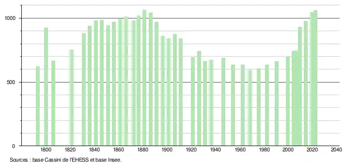 L'évolution du nombre d'habitants est connue à travers les recensements de la population effectués dans la commune depuis 1793. Pour les communes de moins de 10 000 habitants, une enquête de recensement portant sur toute la population est réalisée tous les cinq ans, les populations de référence des années intermédiaires étant quant à elles estimées par interpolation ou extrapolation[30]. Pour la commune, le premier recensement exhaustif entrant dans le cadre du nouveau dispositif a été réalisé en 2004[31].