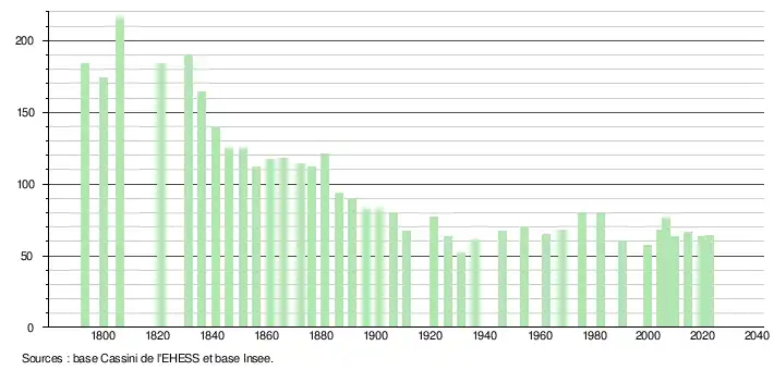 L'évolution du nombre d'habitants est connue à travers les recensements de la population effectués dans la commune depuis 1793. Pour les communes de moins de 10 000 habitants, une enquête de recensement portant sur toute la population est réalisée tous les cinq ans, les populations de référence des années intermédiaires étant quant à elles estimées par interpolation ou extrapolation[17]. Pour la commune, le premier recensement exhaustif entrant dans le cadre du nouveau dispositif a été réalisé en 2004[18].