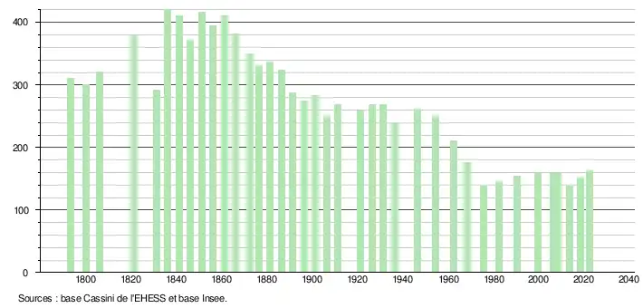 - ↑ Fiches Insee - Populations de référence de la commune pour les années 2006, 2007, 2008, 2009, 2010, 2011, 2012, 2013, 2014, 2015, 2016, 2017, 2018, 2019, 2020, 2021 et 2022.