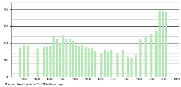 L'évolution du nombre d'habitants est connue à travers les recensements de la population effectués dans la commune depuis 1793. Pour les communes de moins de 10 000 habitants, une enquête de recensement portant sur toute la population est réalisée tous les cinq ans, les populations de référence des années intermédiaires étant quant à elles estimées par interpolation ou extrapolation[15]. Pour la commune, le premier recensement exhaustif entrant dans le cadre du nouveau dispositif a été réalisé en 2007[16].