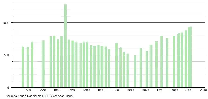 L'évolution du nombre d'habitants est connue à travers les recensements de la population effectués dans la commune depuis 1793. Pour les communes de moins de 10 000 habitants, une enquête de recensement portant sur toute la population est réalisée tous les cinq ans, les populations de référence des années intermédiaires étant quant à elles estimées par interpolation ou extrapolation[23]. Pour la commune, le premier recensement exhaustif entrant dans le cadre du nouveau dispositif a été réalisé en 2005[24].