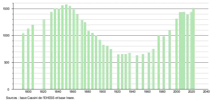 L'évolution du nombre d'habitants est connue à travers les recensements de la population effectués dans la commune depuis 1793. Pour les communes de moins de 10 000 habitants, une enquête de recensement portant sur toute la population est réalisée tous les cinq ans, les populations de référence des années intermédiaires étant quant à elles estimées par interpolation ou extrapolation[30]. Pour la commune, le premier recensement exhaustif entrant dans le cadre du nouveau dispositif a été réalisé en 2004[31].