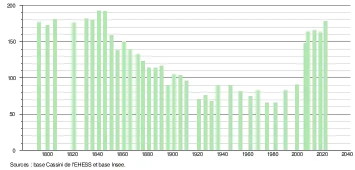 L'évolution du nombre d'habitants est connue à travers les recensements de la population effectués dans la commune depuis 1793. Pour les communes de moins de 10 000 habitants, une enquête de recensement portant sur toute la population est réalisée tous les cinq ans, les populations de référence des années intermédiaires étant quant à elles estimées par interpolation ou extrapolation[17]. Pour la commune, le premier recensement exhaustif entrant dans le cadre du nouveau dispositif a été réalisé en 2008[18].