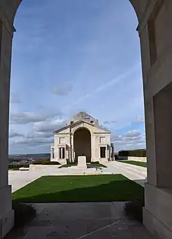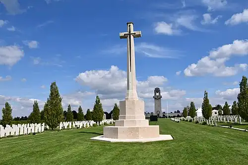 L'entrée du cimetière avec ,en arrière plan, la tour du mémorial australien.