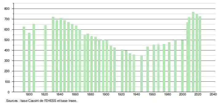 L'évolution du nombre d'habitants est connue à travers les recensements de la population effectués dans la commune depuis 1793. Pour les communes de moins de 10 000 habitants, une enquête de recensement portant sur toute la population est réalisée tous les cinq ans, les populations de référence des années intermédiaires étant quant à elles estimées par interpolation ou extrapolation[30]. Pour la commune, le premier recensement exhaustif entrant dans le cadre du nouveau dispositif a été réalisé en 2008[31].