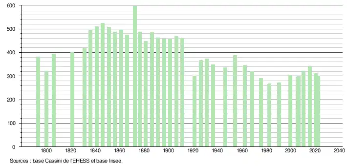 L'évolution du nombre d'habitants est connue à travers les recensements de la population effectués dans la commune depuis 1793. Pour les communes de moins de 10 000 habitants, une enquête de recensement portant sur toute la population est réalisée tous les cinq ans, les populations de référence des années intermédiaires étant quant à elles estimées par interpolation ou extrapolation[33]. Pour la commune, le premier recensement exhaustif entrant dans le cadre du nouveau dispositif a été réalisé en 2005[34].
