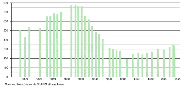 - ↑ Par convention dans Wikipédia, le principe a été retenu de n’afficher dans le tableau des recensements et le graphique, pour les populations légales postérieures à 1999, que les populations correspondant à une enquête exhaustive de recensement pour les communes de moins de 10 000 habitants, et que les populations des années 2006, 2011, 2016, etc. pour les communes de plus de 10 000 habitants, ainsi que la dernière population légale publiée par l’Insee pour l'ensemble des communes.