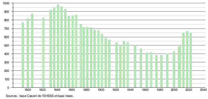 L'évolution du nombre d'habitants est connue à travers les recensements de la population effectués dans la commune depuis 1793. Pour les communes de moins de 10000habitants, une enquête de recensement portant sur toute la population est réalisée tous les cinqans, les populations de référence des années intermédiaires étant quant à elles estimées par interpolation ou extrapolation[13]. Pour la commune, le premier recensement exhaustif entrant dans le cadre du nouveau dispositif a été réalisé en 2007[14].