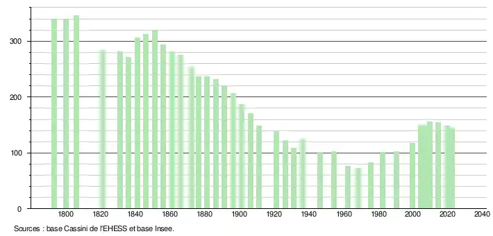 L'évolution du nombre d'habitants est connue à travers les recensements de la population effectués dans la commune depuis 1793. Pour les communes de moins de 10 000 habitants, une enquête de recensement portant sur toute la population est réalisée tous les cinq ans, les populations de référence des années intermédiaires étant quant à elles estimées par interpolation ou extrapolation[15]. Pour la commune, le premier recensement exhaustif entrant dans le cadre du nouveau dispositif a été réalisé en 2004[16].