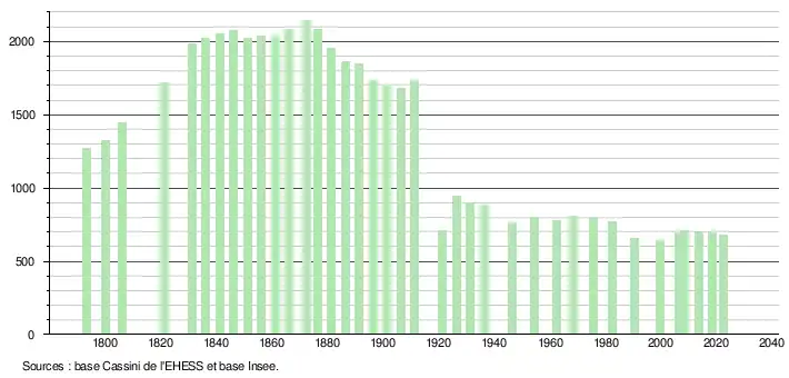 L'évolution du nombre d'habitants est connue à travers les recensements de la population effectués dans la commune depuis 1793. Pour les communes de moins de 10 000 habitants, une enquête de recensement portant sur toute la population est réalisée tous les cinq ans, les populations de référence des années intermédiaires étant quant à elles estimées par interpolation ou extrapolation[30]. Pour la commune, le premier recensement exhaustif entrant dans le cadre du nouveau dispositif a été réalisé en 2008[31].