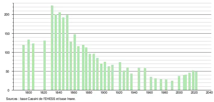 L'évolution du nombre d'habitants est connue à travers les recensements de la population effectués dans la commune depuis 1793. Pour les communes de moins de 10 000 habitants, une enquête de recensement portant sur toute la population est réalisée tous les cinq ans, les populations de référence des années intermédiaires étant quant à elles estimées par interpolation ou extrapolation[18]. Pour la commune, le premier recensement exhaustif entrant dans le cadre du nouveau dispositif a été réalisé en 2008[19].
