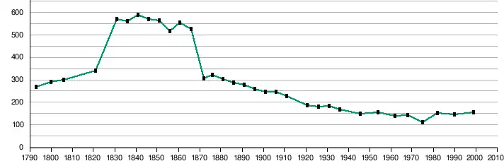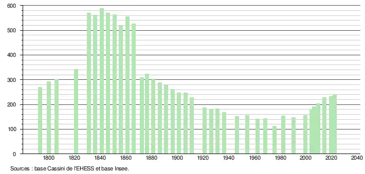 L'évolution du nombre d'habitants est connue à travers les recensements de la population effectués dans la commune depuis 1793. Pour les communes de moins de 10 000 habitants, une enquête de recensement portant sur toute la population est réalisée tous les cinq ans, les populations de référence des années intermédiaires étant quant à elles estimées par interpolation ou extrapolation[15]. Pour la commune, le premier recensement exhaustif entrant dans le cadre du nouveau dispositif a été réalisé en 2004[16].