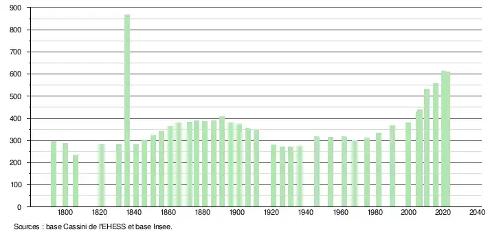 L'évolution du nombre d'habitants est connue à travers les recensements de la population effectués dans la commune depuis 1793. Pour les communes de moins de 10 000 habitants, une enquête de recensement portant sur toute la population est réalisée tous les cinq ans, les populations de référence des années intermédiaires étant quant à elles estimées par interpolation ou extrapolation[27]. Pour la commune, le premier recensement exhaustif entrant dans le cadre du nouveau dispositif a été réalisé en 2005[28].