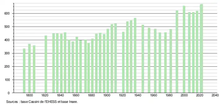 L'évolution du nombre d'habitants est connue à travers les recensements de la population effectués dans la commune depuis 1793. Pour les communes de moins de 10 000 habitants, une enquête de recensement portant sur toute la population est réalisée tous les cinq ans, les populations de référence des années intermédiaires étant quant à elles estimées par interpolation ou extrapolation[20]. Pour la commune, le premier recensement exhaustif entrant dans le cadre du nouveau dispositif a été réalisé en 2006[21].