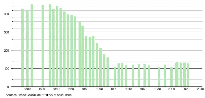 L'évolution du nombre d'habitants est connue à travers les recensements de la population effectués dans la commune depuis 1793. Pour les communes de moins de 10 000 habitants, une enquête de recensement portant sur toute la population est réalisée tous les cinq ans, les populations de référence des années intermédiaires étant quant à elles estimées par interpolation ou extrapolation[17]. Pour la commune, le premier recensement exhaustif entrant dans le cadre du nouveau dispositif a été réalisé en 2007[18].