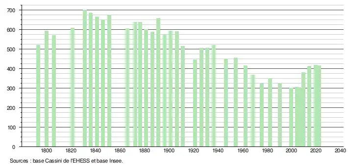 L'évolution du nombre d'habitants est connue à travers les recensements de la population effectués dans la commune depuis 1793. Pour les communes de moins de 10 000 habitants, une enquête de recensement portant sur toute la population est réalisée tous les cinq ans, les populations de référence des années intermédiaires étant quant à elles estimées par interpolation ou extrapolation[20]. Pour la commune, le premier recensement exhaustif entrant dans le cadre du nouveau dispositif a été réalisé en 2004[21].