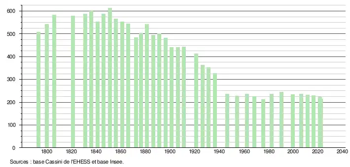 L'évolution du nombre d'habitants est connue à travers les recensements de la population effectués dans la commune depuis 1793. Pour les communes de moins de 10 000 habitants, une enquête de recensement portant sur toute la population est réalisée tous les cinq ans, les populations de référence des années intermédiaires étant quant à elles estimées par interpolation ou extrapolation[29]. Pour la commune, le premier recensement exhaustif entrant dans le cadre du nouveau dispositif a été réalisé en 2006[30].