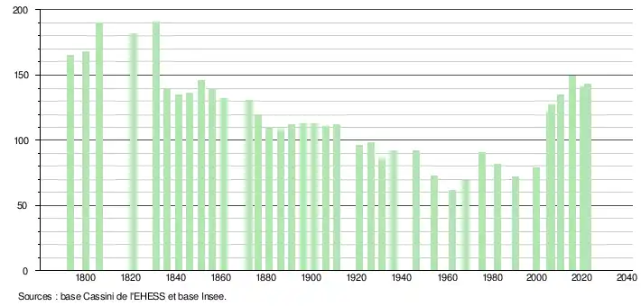 - ↑ Population municipale de référence en vigueur au 1er janvier 2025, millésimée 2022, définie dans les limites territoriales en vigueur au 1er janvier 2024, date de référence statistique : 1er janvier 2022.