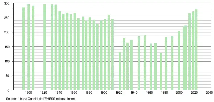 L'évolution du nombre d'habitants est connue à travers les recensements de la population effectués dans la commune depuis 1793. Pour les communes de moins de 10 000 habitants, une enquête de recensement portant sur toute la population est réalisée tous les cinq ans, les populations de référence des années intermédiaires étant quant à elles estimées par interpolation ou extrapolation[26]. Pour la commune, le premier recensement exhaustif entrant dans le cadre du nouveau dispositif a été réalisé en 2008[27].