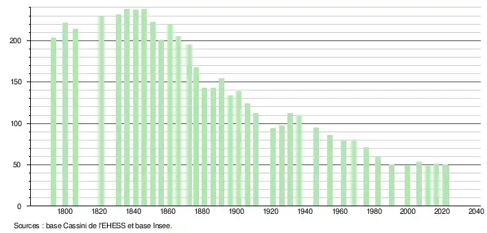 L'évolution du nombre d'habitants est connue à travers les recensements de la population effectués dans la commune depuis 1793. Pour les communes de moins de 10 000 habitants, une enquête de recensement portant sur toute la population est réalisée tous les cinq ans, les populations de référence des années intermédiaires étant quant à elles estimées par interpolation ou extrapolation[15]. Pour la commune, le premier recensement exhaustif entrant dans le cadre du nouveau dispositif a été réalisé en 2006[16].