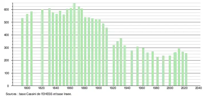 L'évolution du nombre d'habitants est connue à travers les recensements de la population effectués dans la commune depuis 1793. Pour les communes de moins de 10 000 habitants, une enquête de recensement portant sur toute la population est réalisée tous les cinq ans, les populations de référence des années intermédiaires étant quant à elles estimées par interpolation ou extrapolation[19]. Pour la commune, le premier recensement exhaustif entrant dans le cadre du nouveau dispositif a été réalisé en 2007[20].