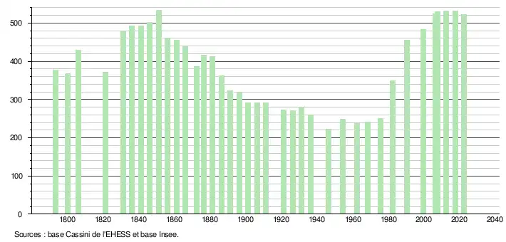 L'évolution du nombre d'habitants est connue à travers les recensements de la population effectués dans la commune depuis 1793. Pour les communes de moins de 10 000 habitants, une enquête de recensement portant sur toute la population est réalisée tous les cinq ans, les populations de référence des années intermédiaires étant quant à elles estimées par interpolation ou extrapolation[17]. Pour la commune, le premier recensement exhaustif entrant dans le cadre du nouveau dispositif a été réalisé en 2007[18].