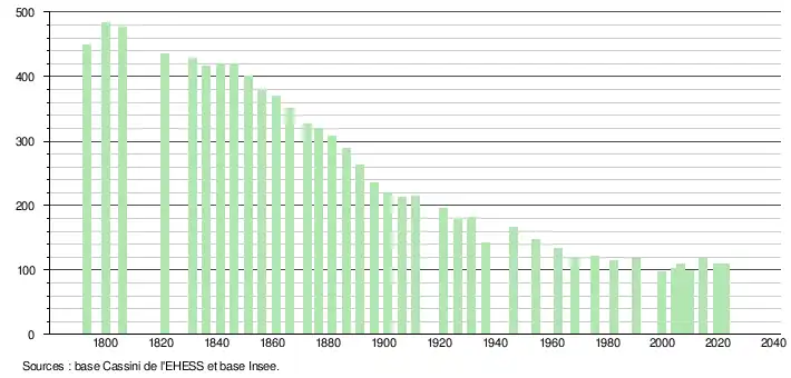 L'évolution du nombre d'habitants est connue à travers les recensements de la population effectués dans la commune depuis 1793. Pour les communes de moins de 10 000 habitants, une enquête de recensement portant sur toute la population est réalisée tous les cinq ans, les populations de référence des années intermédiaires étant quant à elles estimées par interpolation ou extrapolation[29]. Pour la commune, le premier recensement exhaustif entrant dans le cadre du nouveau dispositif a été réalisé en 2004[30].