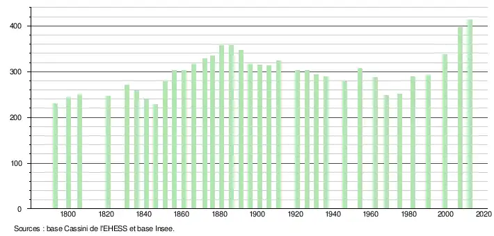 L'évolution du nombre d'habitants est connue à travers les recensements de la population effectués dans la commune depuis 1793. À partir du , les populations légales des communes sont publiées annuellement dans le cadre d'un recensement qui repose désormais sur une collecte d'information annuelle, concernant successivement tous les territoires communaux au cours d'une période de cinq ans. Pour les communes de moins de 10 000 habitants, une enquête de recensement portant sur toute la population est réalisée tous les cinq ans, les populations légales des années intermédiaires étant quant à elles estimées par interpolation ou extrapolation[12]. Pour la commune, le premier recensement exhaustif entrant dans le cadre du nouveau dispositif a été réalisé en 2007[13],[Note 1].